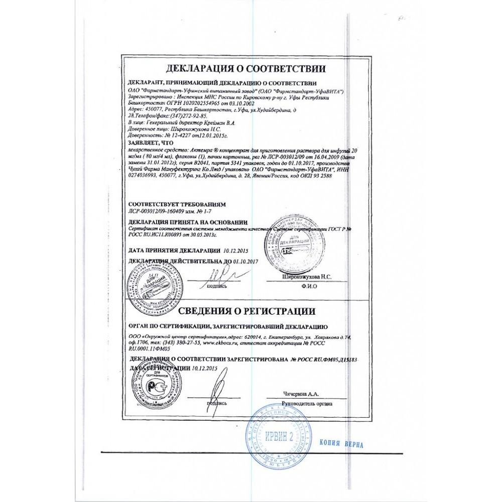 Доступные данные о передозировке препарата Актемра® ограничены. В одном случае непреднамеренной передозировки препарата в дозе 40 мг/кг у пациента с множественной миеломой нежелательных реакций не отмечено. Не отмечалось также серьезных нежелательных реакций у здоровых добровольцев, которые получали однократно препарат Актемра® в дозе до 28 мг/кг, хотя наблюдалась нейтропения, требующая снижения дозы.