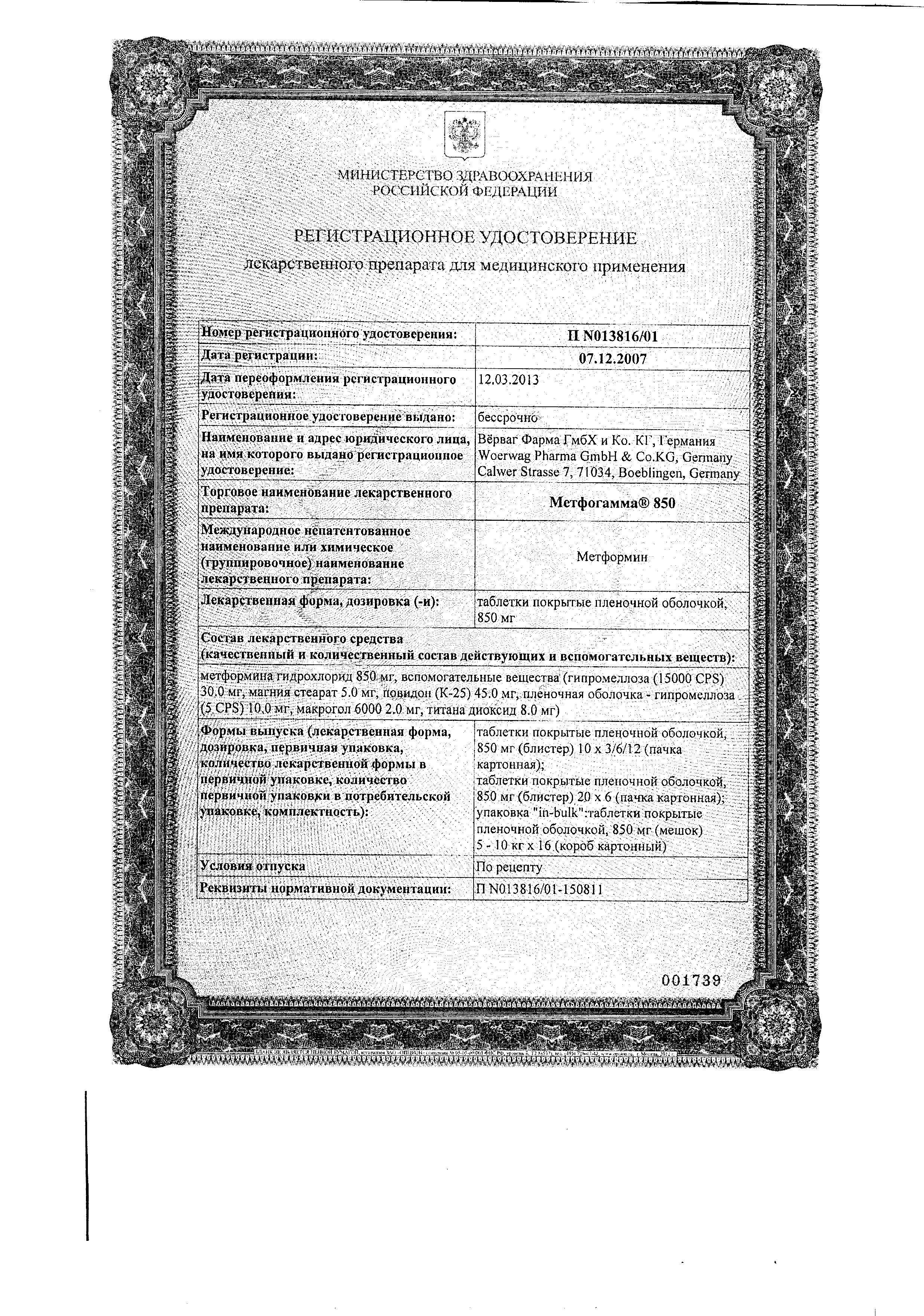 Активное вещество: метформина гидрохлорид - 850 мг.