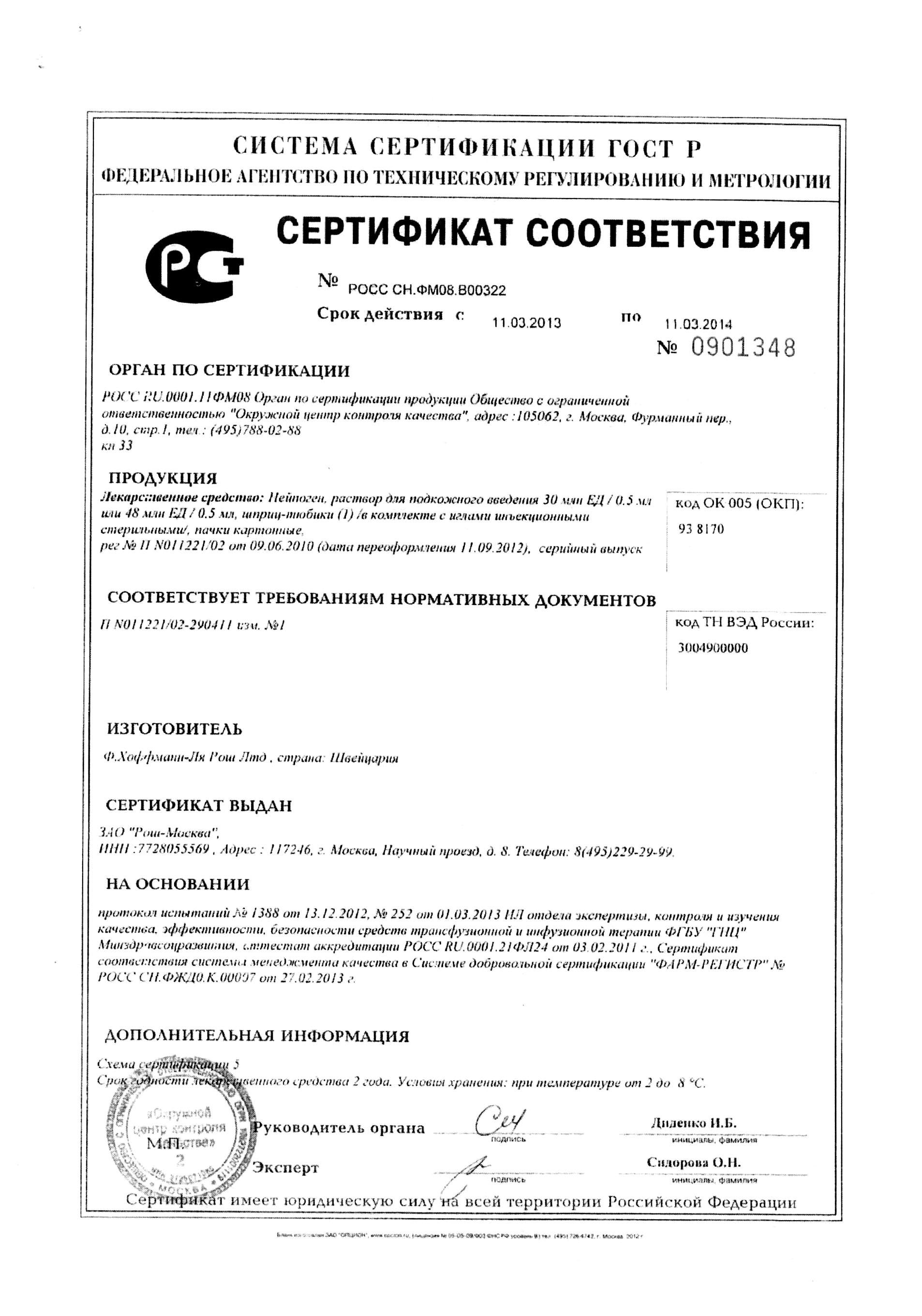 Вспомогательные вещества: ледяная уксусная кислота - 0.3 мг, 1 н раствор натрия гидроксида - q.s. до рН 4, сорбитол - 25 мг, полисорбат 80 - 0.02 мг, вода д/и - до 0.5 мл.