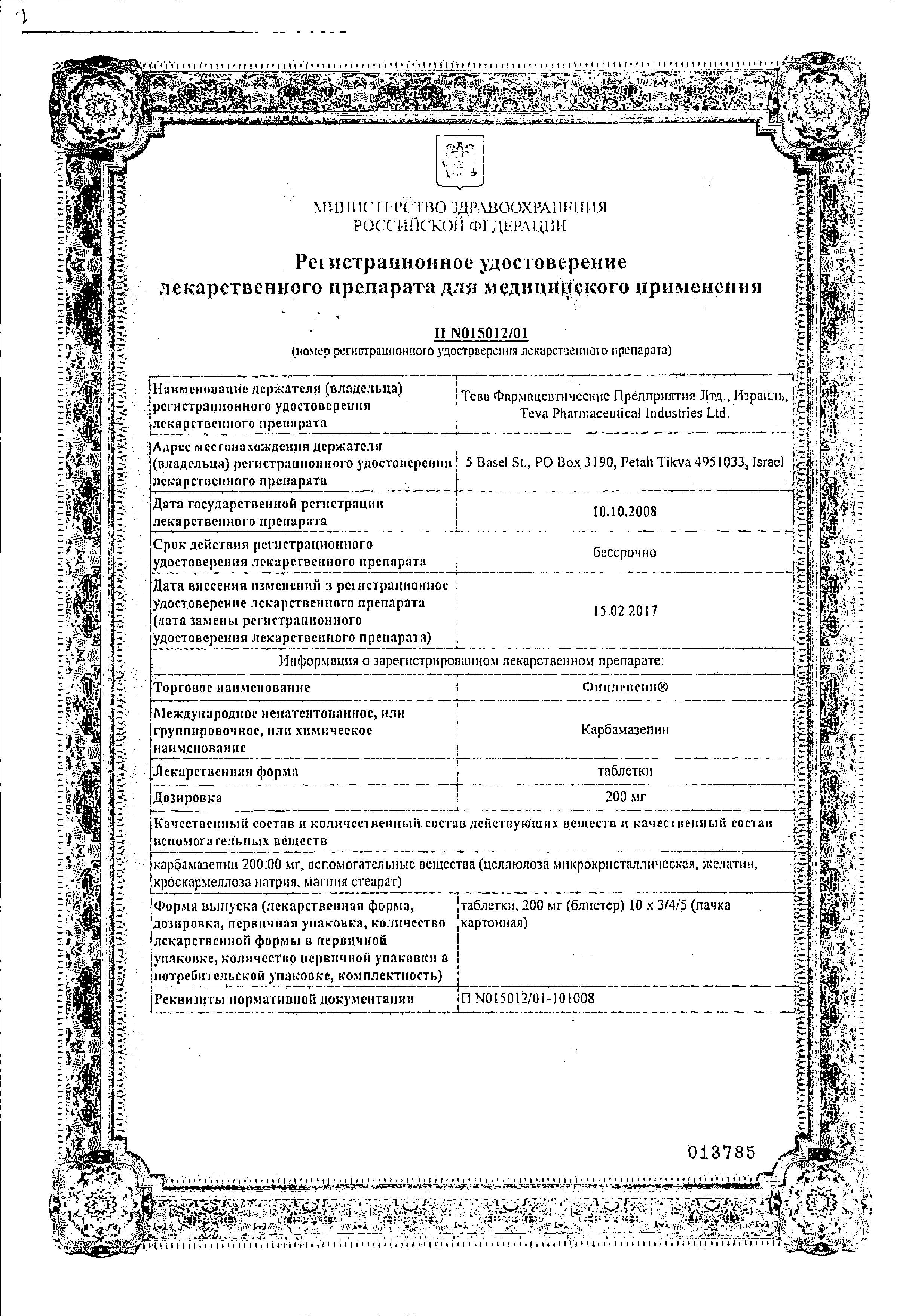 Противоэпилептический препарат (производное дибензазепина), оказывающий также антидепрессивное, антипсихотическое и антидиуретическое действие, обладает анальгезирующим действием у больных с невралгией. Механизм действия связан с блокадой потенциал-зависимых натриевых каналов, что приводит к стабилизации мембраны перевозбужденных нейронов, ингибированию возникновения серийных разрядов нейронов и снижению синаптического проведения импульсов. Предотвращает повторное образование Na+-зависимых потенциалов действия в деполяризованных нейронах. Снижает высвобождение возбуждающей нейромедиаторной аминокислоты глутамата, повышает сниженный судорожный порог ЦНС и, таким образом, уменьшает риск развития эпилептического приступа. Увеличивает проводимость K+, модулирует потенциал-зависимые Ca2+каналы, что также может вносить вклад в противосудорожное действие препарата. Эффективен при фокальных (парциальных) эпилептических приступах (простых и комплексных), сопровождающихся или не сопровождающихся вторичной генерализацией, при генерализованных тонико-клонических эпилептических приступах, а также при комбинации указанных типов приступов (обычно неэффективен при малых приступах - petit mal, абсансах и миоклонических приступах). У пациентов с эпилепсией (в особенности у детей и подростков) отмечено положительное влияние на симптомы тревожности и депрессии, а также снижение раздражительности и агрессивности. Влияние на когнитивную функцию и психомоторные показатели зависит от дозы. Начало противосудорожного эффекта варьирует от нескольких часов до нескольких дней (иногда до 1 мес вследствие аутоиндукции метаболизма).