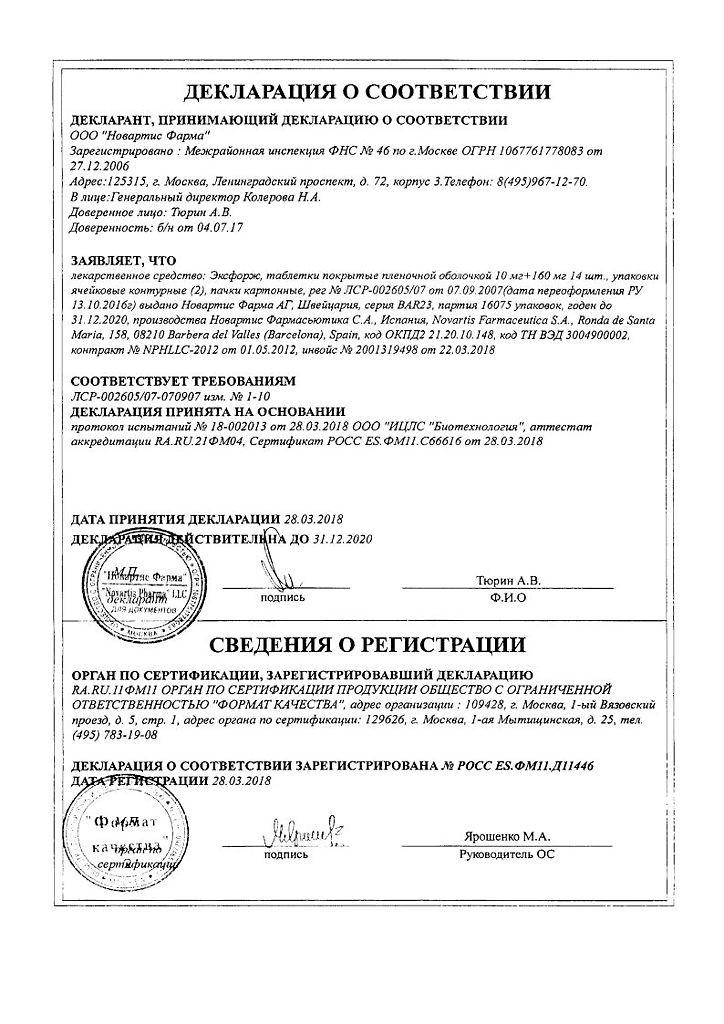 Применение. Exforge следует принимать внутрь, запивая небольшим количеством воды, 1 раз в сутки независимо от времени приема пищи. Рекомендуемая суточная доза - 1 таблетка Эксфоржа, содержащая амлодипин/валсартан в дозе 10/160 мг.